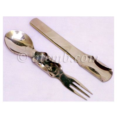 Combination knife, fork and spoon set accurately copied from original piece as sold in the 1861 Schuyler, Hartley & Graham military goods catalogue. Not only does it fold up but a slight pull reveals that it comes apart to make two seperate pieces.
