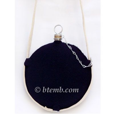 Stainless steel canteen with stainless steel spout. Chain and cork included. Dark Blue wool cover. Wool covers available in the following colors - Dark Blue, Grey, Sky Blue, Tan. Canvas sling. Available in smooth sides and Bullseye.