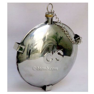Stainless steel CS canteen with stainless steel spout. Chain and cork included. CS embossed. Supplied with canvas sling.