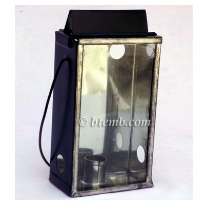 Hand made. Front glass slides up to light or change the candle. Black coated tin exterior with shiny tin interior for reflection. Includes handle for carrying.